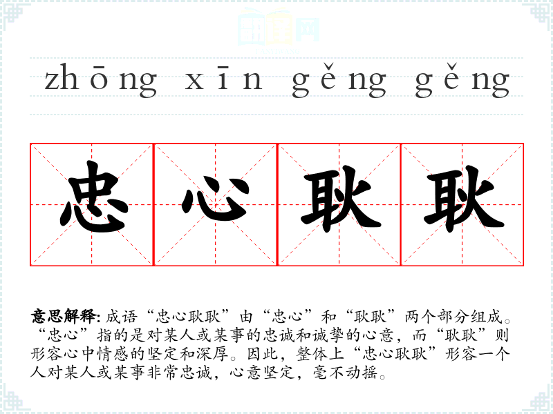 成语“忠心耿耿”由“忠心”和“耿耿”两个部分组成。“忠心”指的是对某人或某事的忠诚和诚挚的心意,而“耿耿”则形容心中情感的坚定和深厚。因此,整体上“忠心耿耿”形容一个人对某人或某事非常忠诚,心意坚定,毫不动摇。