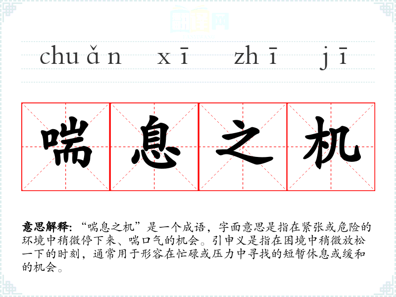 “喘息之机”是一个成语,字面意思是指在紧张或危险的环境中稍微停下来、喘口气的机会。引申义是指在困境中稍微放松一下的时刻,通常用于形容在忙碌或压力中寻找的短暂休息或缓和的机会。