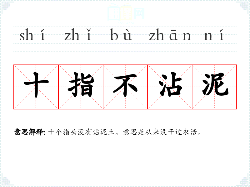 | 十指不沾泥 | 十个指头没有沾泥土。意思是从来没干过农活。 |
