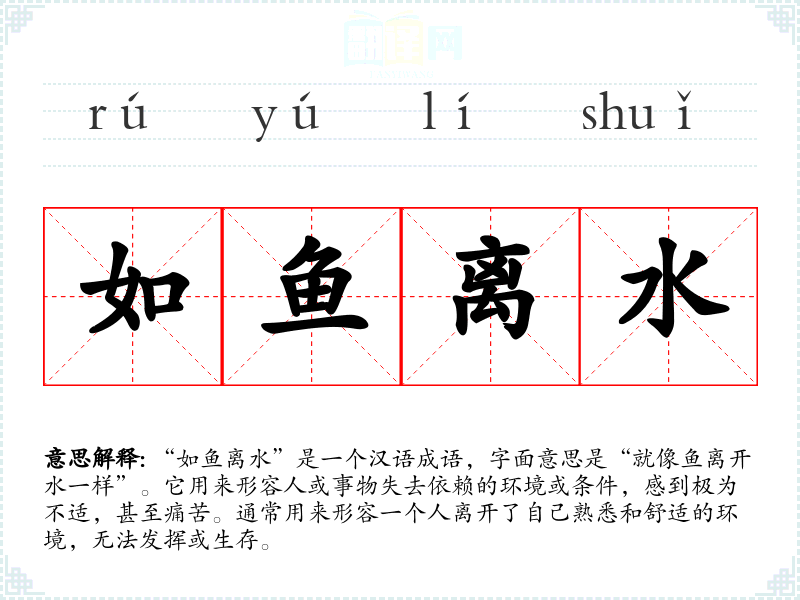 “如鱼离水”是一个汉语成语,字面意思是“就像鱼离开水一样”。它用来形容人或事物失去依赖的环境或条件,感到极为不适,甚至痛苦。通常用来形容一个人离开了自己熟悉和舒适的环境,无法发挥或生存。