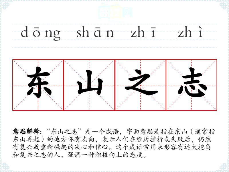 “东山之志”是一个成语,字面意思是指在东山(通常指东山再起)的地方怀有志向,表示人们在经历挫折或失败后,仍然有复兴或重新崛起的决心和信心。这个成语常用来形容有远大抱负和复兴之志的人,强调一种积极向上的态度。
