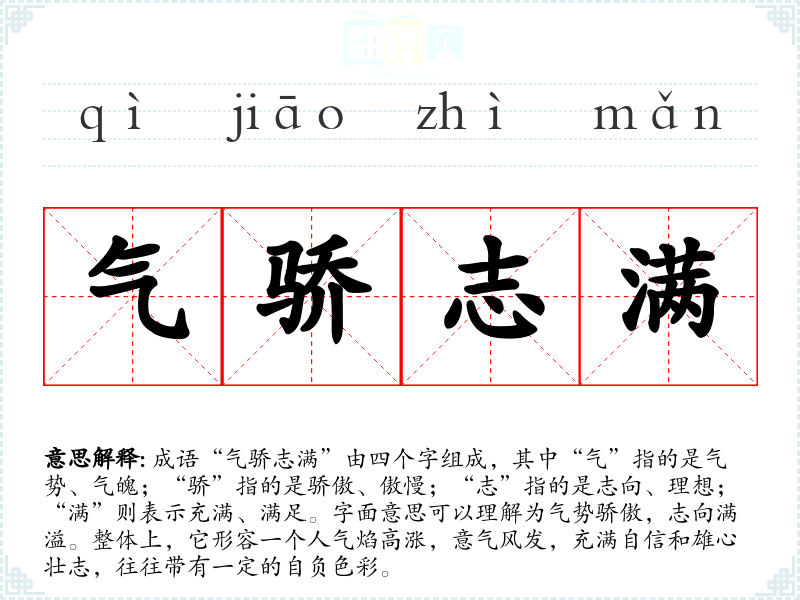 成语“气骄志满”由四个字组成,其中“气”指的是气势、气魄;“骄”指的是骄傲、傲慢;“志”指的是志向、理想;“满”则表示充满、满足。字面意思可以理解为气势骄傲,志向满溢。整体上,它形容一个人气焰高涨,意气风发,充满自信和雄心壮志,往往带有一定的自负色彩。