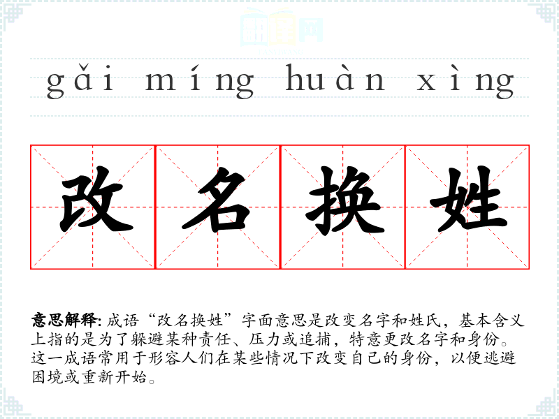 成语“改名换姓”字面意思是改变名字和姓氏,基本含义上指的是为了躲避某种责任、压力或追捕,特意更改名字和身份。这一成语常用于形容人们在某些情况下改变自己的身份,以便逃避困境或重新开始。