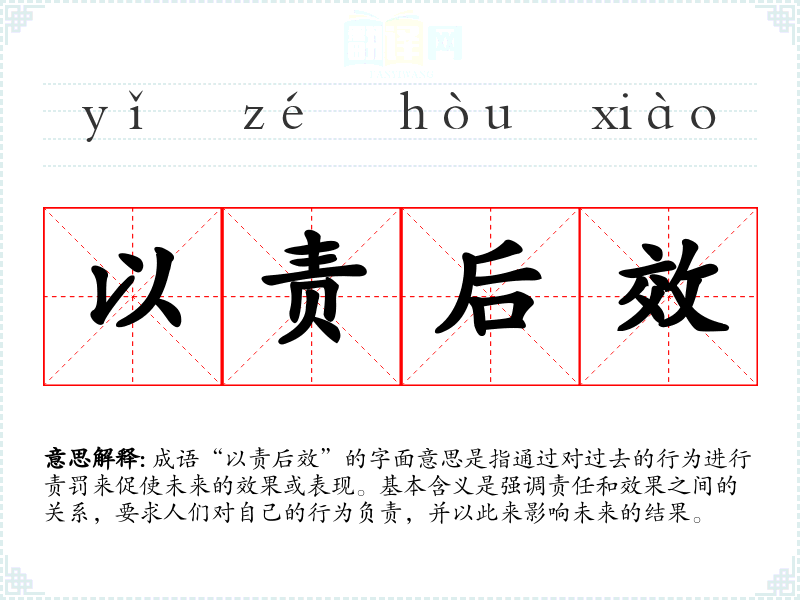 成语“以责后效”的字面意思是指通过对过去的行为进行责罚来促使未来的效果或表现。基本含义是强调责任和效果之间的关系,要求人们对自己的行为负责,并以此来影响未来的结果。