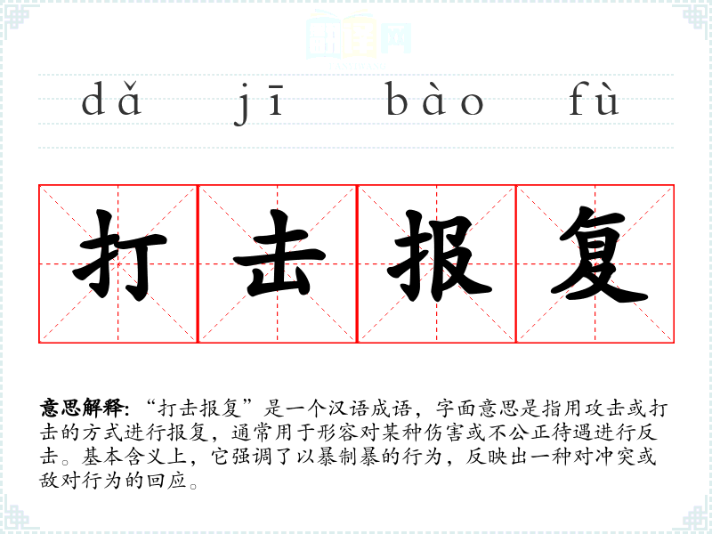 “打击报复”是一个汉语成语,字面意思是指用攻击或打击的方式进行报复,通常用于形容对某种伤害或不公正待遇进行反击。基本含义上,它强调了以暴制暴的行为,反映出一种对冲突或敌对行为的回应。