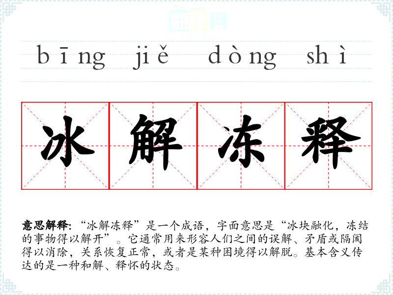 - 日常对话:当人们化解误会时,可以说“经过沟通,冰解冻释了”。
