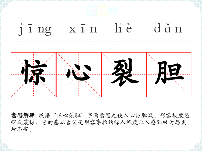 成语“惊心裂胆”字面意思是使人心惊胆战,形容极度恐惧或震惊。它的基本含义是形容事物的惊人程度让人感到极为恐惧和不安。