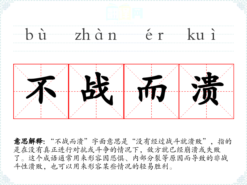 “不战而溃”字面意思是“没有经过战斗就溃败”,指的是在没有真正进行对抗或斗争的情况下,敌方就已经崩溃或失败了。这个成语通常用来形容因恐惧、内部分裂等原因而导致的非战斗性溃败,也可以用来形容某些情况的轻易胜利。