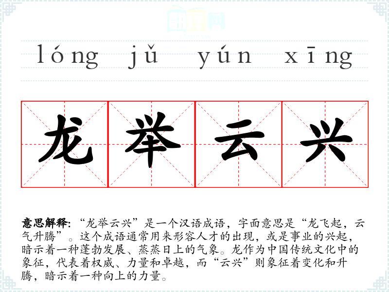 在**传统文化中,龙被视为吉祥的象征,常常与权力、成功和进步关联。因此,“龙举云兴”不仅体现了对个人或事业成功的期待,也反映了社会对优秀人才和成就的崇拜。在现代社会,这个成语仍然适用于形容创业者、创新者的崛起,具有普遍的适用性。