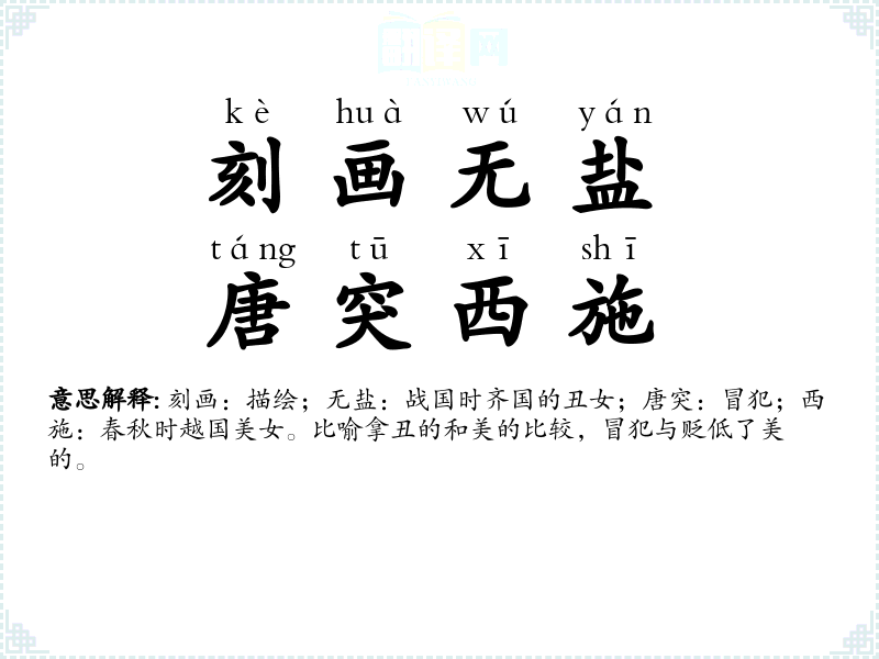 刻画:描绘;无盐:战国时齐国的丑女;唐突:冒犯;西施:春秋时越国美女。比喻拿丑的和美的比较,冒犯与贬低了美的。 |