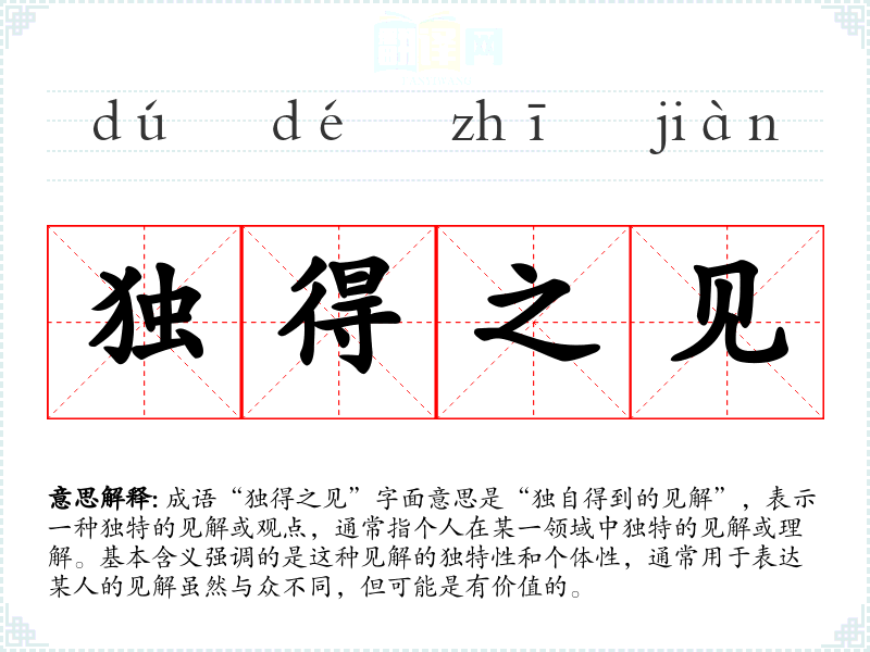 成语“独得之见”字面意思是“独自得到的见解”,表示一种独特的见解或观点,通常指个人在某一领域中独特的见解或理解。基本含义强调的是这种见解的独特性和个体性,通常用于表达某人的见解虽然与众不同,但可能是有价值的。