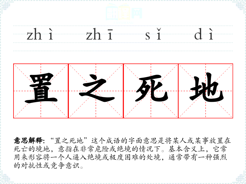“置之死地”这个成语的字面意思是将某人或某事放置在死亡的境地,意指在非常危险或绝境的情况下。基本含义上,它常用来形容将一个人逼入绝境或极度困难的处境,通常带有一种强烈的对抗性或竞争意识。