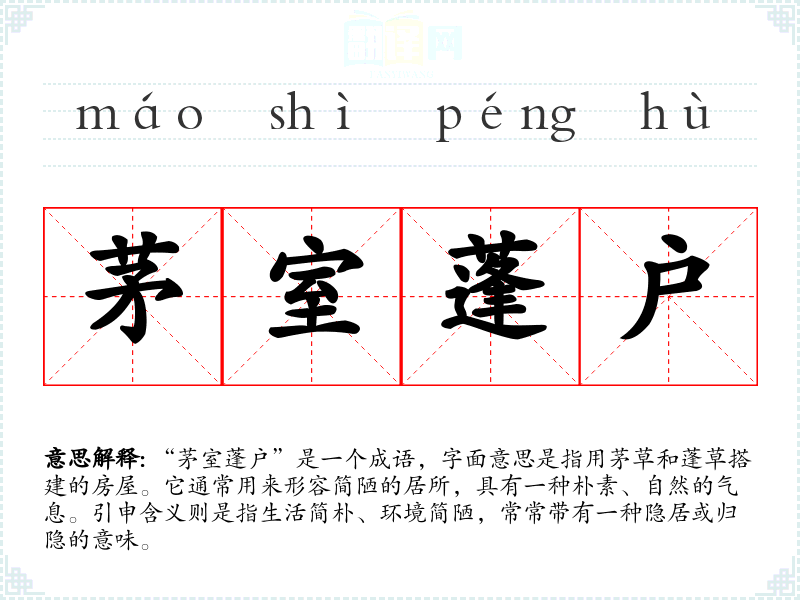 | 茅茨不翦 | 茅茨:茅屋;翦:修饰。用茅草覆盖屋顶,而且没有修剪整齐。形容生活简陋俭朴。 |