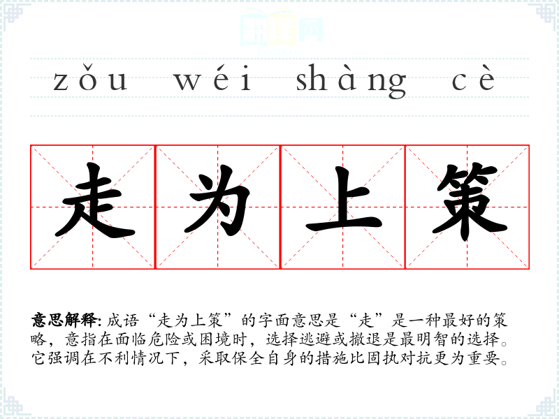 - 日常对话:在朋友之间讨论问题时,若遇到棘手的局面,可以提到“走为上策”,以建议对方从容应对。