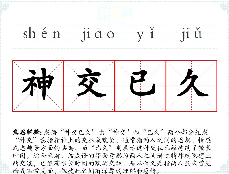 成语“神交已久”由“神交”和“已久”两个部分组成。“神交”意指精神上的交往或默契,通常指两人之间的思想、情感或志趣等方面的共鸣,而“已久”则表示这种交往已经持续了较长时间。综合来看,该成语的字面意思为两人之间通过精神或思想上的交流,已经有很长时间的默契交往。基本含义是指两人虽未曾见面或不常见面,但彼此之间有深厚的理解和感情。