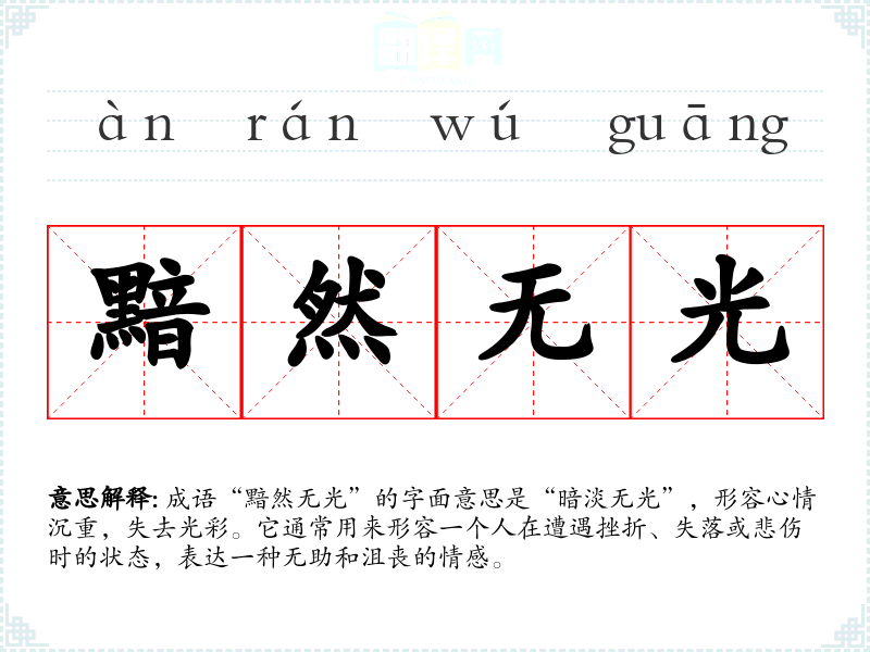 成语“黯然无光”的字面意思是“暗淡无光”,形容心情沉重,失去光彩。它通常用来形容一个人在遭遇挫折、失落或悲伤时的状态,表达一种无助和沮丧的情感。