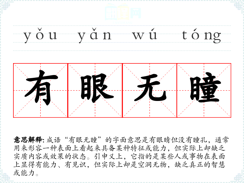 成语“有眼无瞳”的字面意思是有眼睛但没有瞳孔,通常用来形容一种表面上看起来具备某种特征或能力,但实际上却缺乏实质内容或效果的状态。引申义上,它指的是某些人或事物在表面上显得有能力、有见识,但实际上却是空洞无物,缺乏真正的智慧或能力。