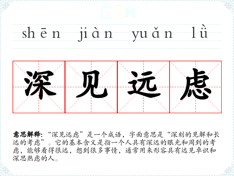 “深见远虑”是一个成语,字面意思是“深刻的见解和长远的考虑”。它的基本含义是指一个人具有深远的眼光和周到的考虑,能够看得很远,想到很多事情,通常用来形容具有远见卓识和深思熟虑的人。