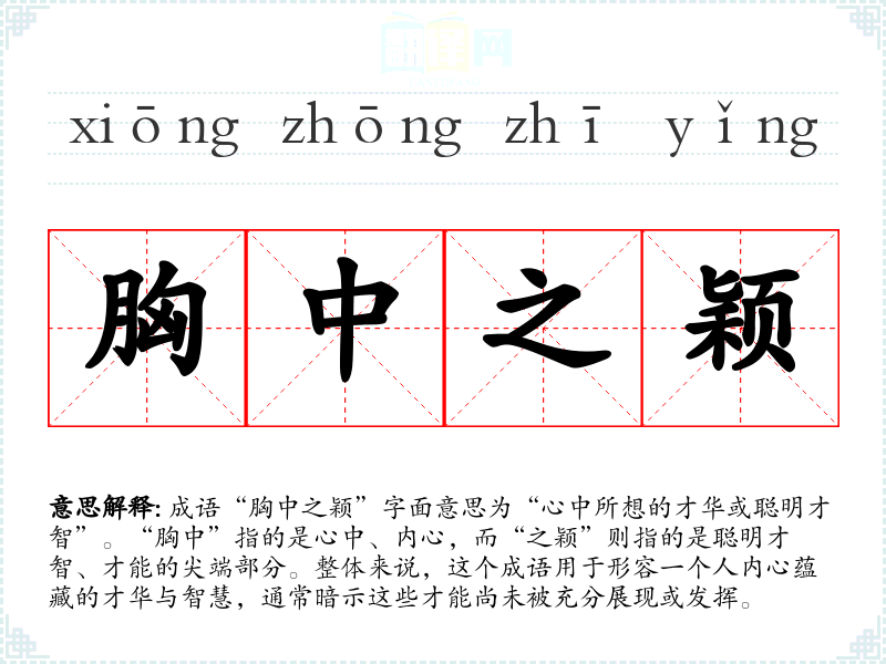 成语“胸中之颖”字面意思为“心中所想的才华或聪明才智”。“胸中”指的是心中、内心,而“之颖”则指的是聪明才智、才能的尖端部分。整体来说,这个成语用于形容一个人内心蕴藏的才华与智慧,通常暗示这些才能尚未被充分展现或发挥。