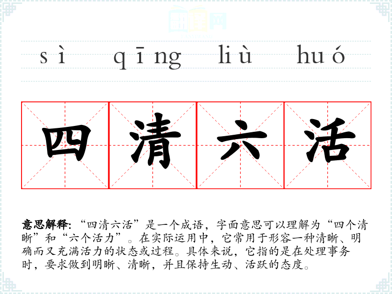 在英语中,“clear and active”可以作为对“四清六活”的一种简单翻译,但它并没有特定的成语对应,反映出文化在表达清晰度和活力上的不同侧重。