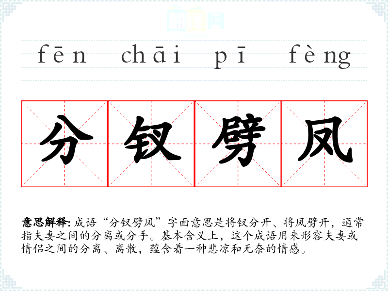 成语“分钗劈凤”字面意思是将钗分开、将凤劈开,通常指夫妻之间的分离或分手。基本含义上,这个成语用来形容夫妻或情侣之间的分离、离散,蕴含着一种悲凉和无奈的情感。
