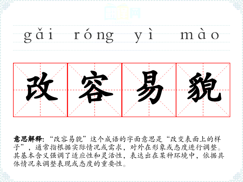 “改容易貌”这个成语的字面意思是“改变表面上的样子”,通常指根据实际情况或需求,对外在形象或态度进行调整。其基本含义强调了适应性和灵活性,表达出在某种环境中,依据具体情况来调整表现或态度的重要性。