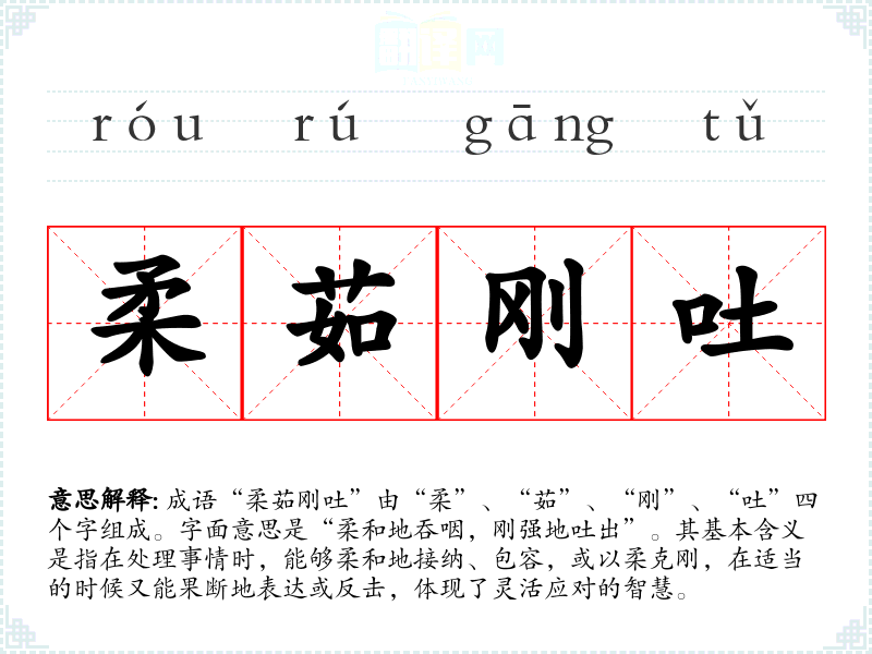 成语“柔茹刚吐”由“柔”、“茹”、“刚”、“吐”四个字组成。字面意思是“柔和地吞咽,刚强地吐出”。其基本含义是指在处理事情时,能够柔和地接纳、包容,或以柔克刚,在适当的时候又能果断地表达或反击,体现了灵活应对的智慧。