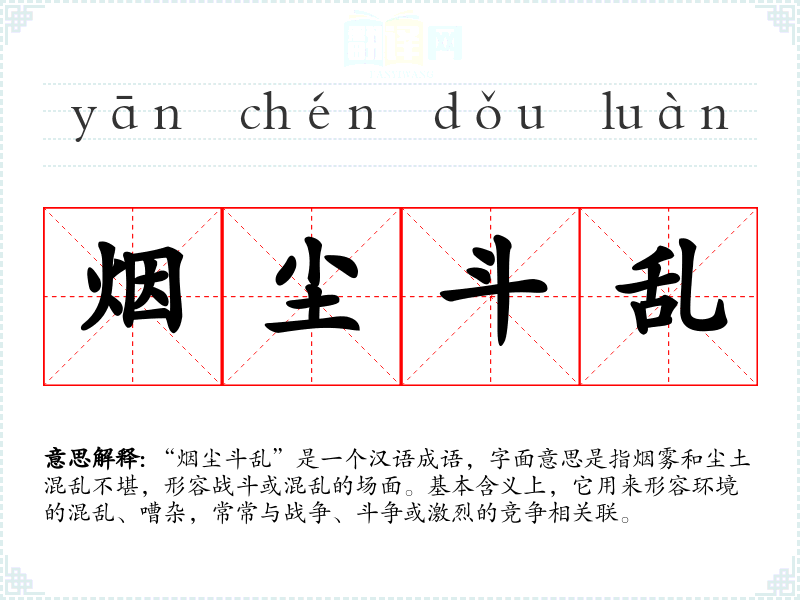 “烟尘斗乱”是一个汉语成语,字面意思是指烟雾和尘土混乱不堪,形容战斗或混乱的场面。基本含义上,它用来形容环境的混乱、嘈杂,常常与战争、斗争或激烈的竞争相关联。
