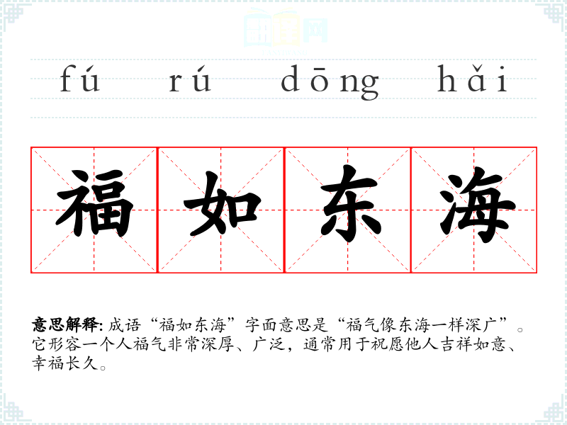 成语“福如东海”字面意思是“福气像东海一样深广”。它形容一个人福气非常深厚、广泛,通常用于祝愿他人吉祥如意、幸福长久。