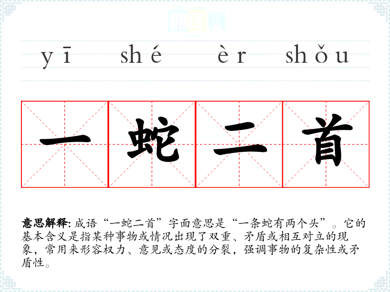 成语“一蛇二首”字面意思是“一条蛇有两个头”。它的基本含义是指某种事物或情况出现了双重、矛盾或相互对立的现象,常用来形容权力、意见或态度的分裂,强调事物的复杂性或矛盾性。