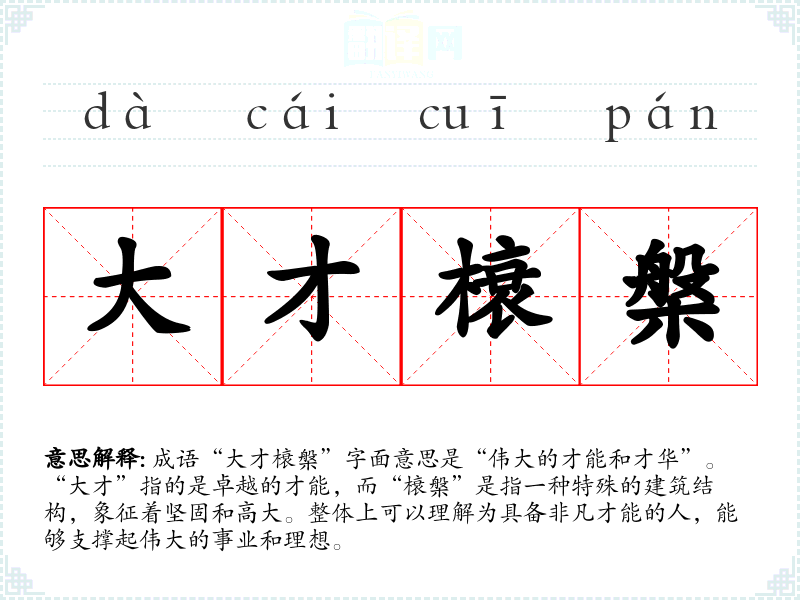 成语“大才榱槃”字面意思是“伟大的才能和才华”。“大才”指的是卓越的才能,而“榱槃”是指一种特殊的建筑结构,象征着坚固和高大。整体上可以理解为具备非凡才能的人,能够支撑起伟大的事业和理想。