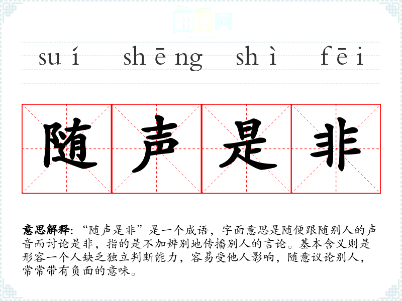 “随声是非”是一个成语,字面意思是随便跟随别人的声音而讨论是非,指的是不加辨别地传播别人的言论。基本含义则是形容一个人缺乏独立判断能力,容易受他人影响,随意议论别人,常常带有负面的意味。