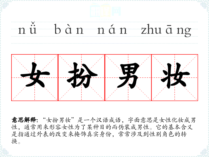 - “女装男扮”:意思相同,指女性装扮成男性。