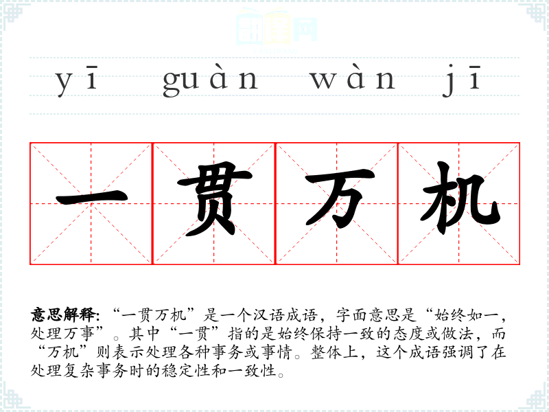 “一贯万机”是一个汉语成语,字面意思是“始终如一,处理万事”。其中“一贯”指的是始终保持一致的态度或做法,而“万机”则表示处理各种事务或事情。整体上,这个成语强调了在处理复杂事务时的稳定性和一致性。