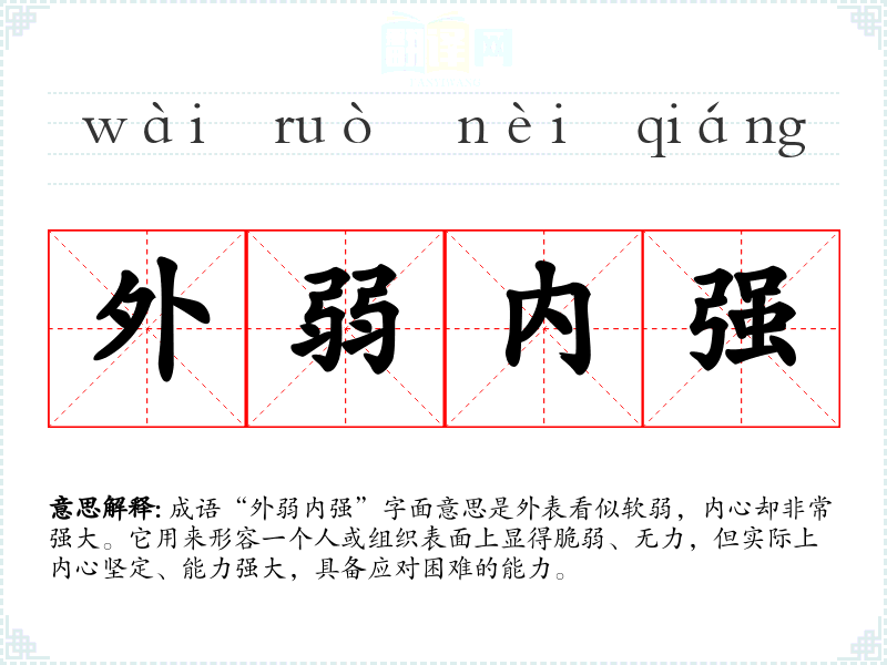 成语“外弱内强”字面意思是外表看似软弱,内心却非常强大。它用来形容一个人或组织表面上显得脆弱、无力,但实际上内心坚定、能力强大,具备应对困难的能力。