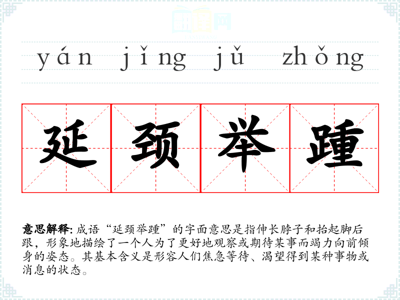 成语“延颈举踵”的字面意思是指伸长脖子和抬起脚后跟,形象地描绘了一个人为了更好地观察或期待某事而竭力向前倾身的姿态。其基本含义是形容人们焦急等待、渴望得到某种事物或消息的状态。