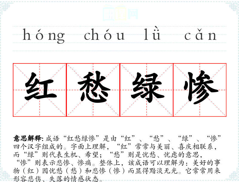 成语“红愁绿惨”是由“红”、“愁”、“绿”、“惨”四个汉字组成的。字面上理解,“红”常常与美丽、喜庆相联系,而“绿”则代表生机、希望;“愁”则是忧愁、忧虑的意思,“惨”则表示悲惨、惨痛。整体上,该成语可以理解为:美好的事物(红)因忧愁(愁)和悲惨(惨)而显得黯淡无光。它常常用来形容悲伤、失落的情感状态。