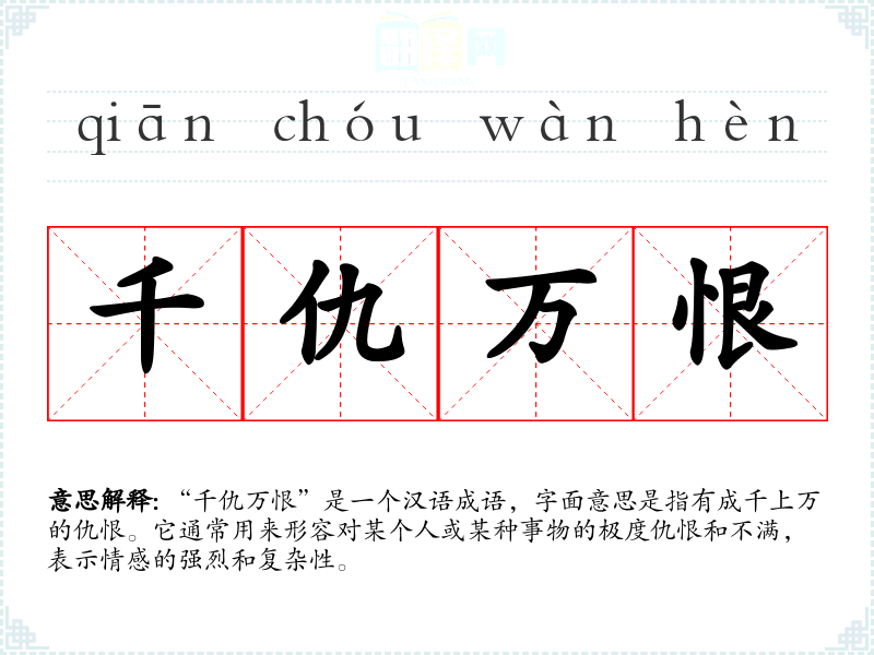 - 同义成语:仇恨如潮、恨之入骨。它们都表达了强烈的仇恨情感,但“千仇万恨”更强调数量和程度。