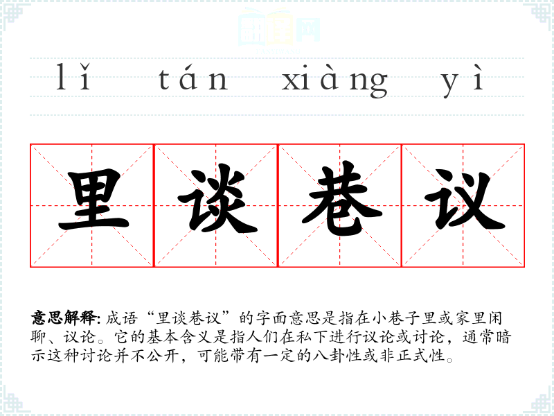 成语“里谈巷议”的字面意思是指在小巷子里或家里闲聊、议论。它的基本含义是指人们在私下进行议论或讨论,通常暗示这种讨论并不公开,可能带有一定的八卦性或非正式性。