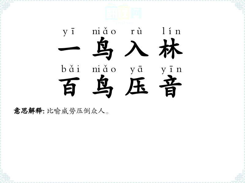 | 一鸟入林,百鸟压音 | 比喻威势压倒众人。 |