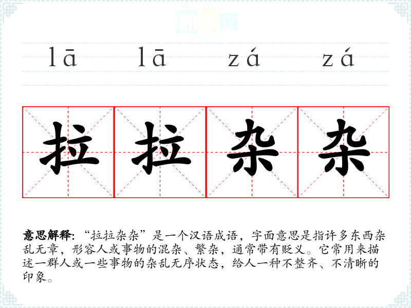 “拉拉杂杂”是一个汉语成语,字面意思是指许多东西杂乱无章,形容人或事物的混杂、繁杂,通常带有贬义。它常用来描述一群人或一些事物的杂乱无序状态,给人一种不整齐、不清晰的印象。