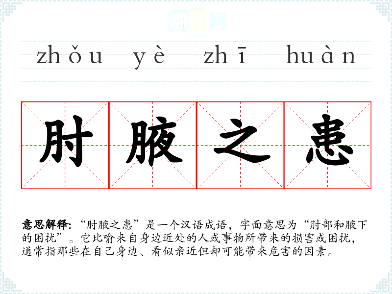“肘腋之患”是一个汉语成语,字面意思为“肘部和腋下的困扰”。它比喻来自身边近处的人或事物所带来的损害或困扰,通常指那些在自己身边、看似亲近但却可能带来危害的因素。