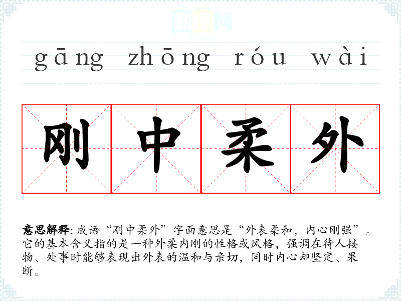 成语“刚中柔外”字面意思是“外表柔和,内心刚强”。它的基本含义指的是一种外柔内刚的性格或风格,强调在待人接物、处事时能够表现出外表的温和与亲切,同时内心却坚定、果断。