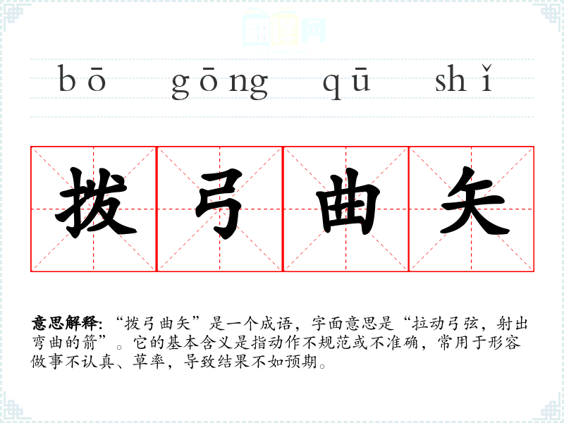 “拨弓曲矢”是一个成语,字面意思是“拉动弓弦,射出弯曲的箭”。它的基本含义是指动作不规范或不准确,常用于形容做事不认真、草率,导致结果不如预期。