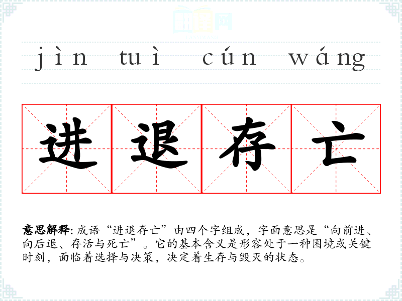 成语“进退存亡”由四个字组成,字面意思是“向前进、向后退、存活与死亡”。它的基本含义是形容处于一种困境或关键时刻,面临着选择与决策,决定着生存与毁灭的状态。