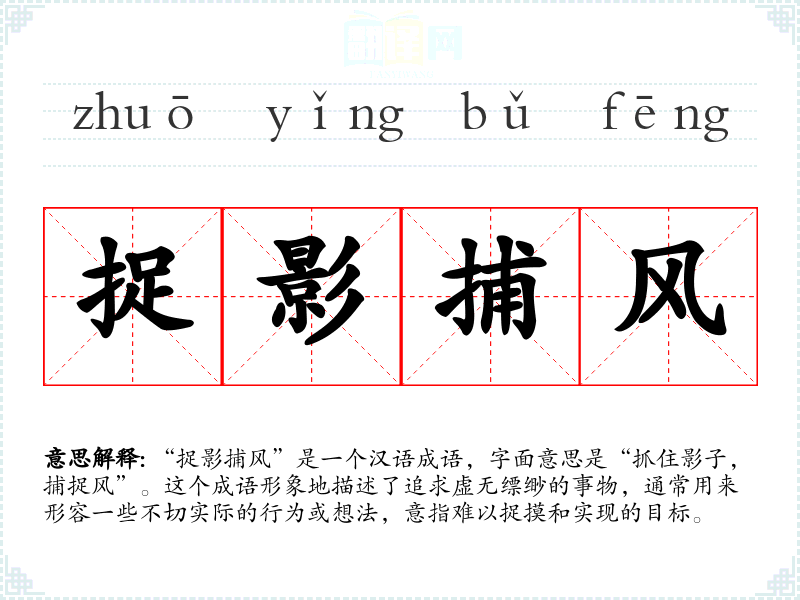 “捉影捕风”是一个汉语成语,字面意思是“抓住影子,捕捉风”。这个成语形象地描述了追求虚无缥缈的事物,通常用来形容一些不切实际的行为或想法,意指难以捉摸和实现的目标。