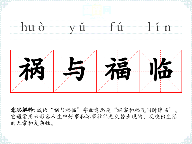 成语“祸与福临”字面意思是“祸害和福气同时降临”。它通常用来形容人生中好事和坏事往往是交替出现的,反映出生活的无常和复杂性。