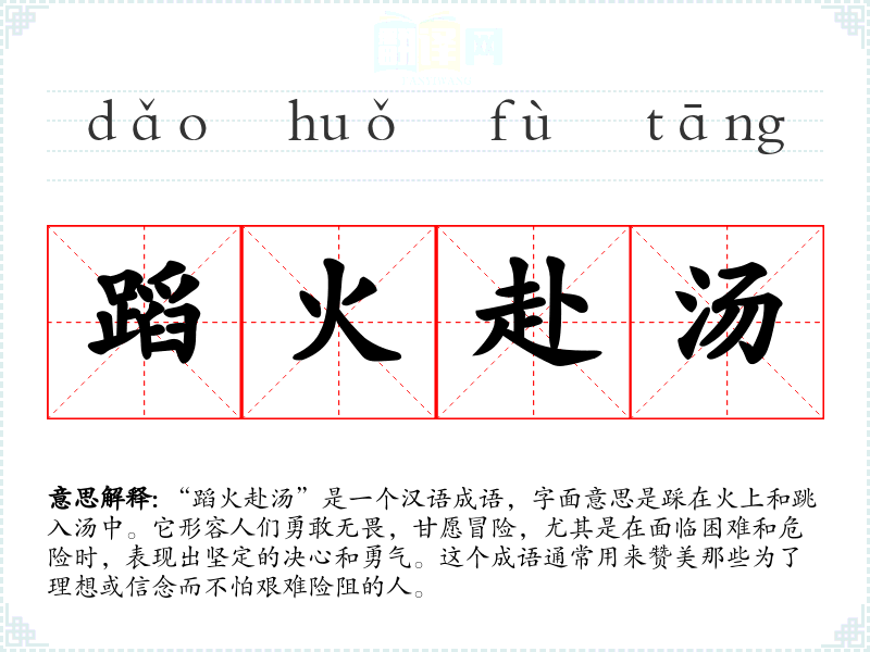 “蹈火赴汤”是一个汉语成语,字面意思是踩在火上和跳入汤中。它形容人们勇敢无畏,甘愿冒险,尤其是在面临困难和危险时,表现出坚定的决心和勇气。这个成语通常用来赞美那些为了理想或信念而不怕艰难险阻的人。