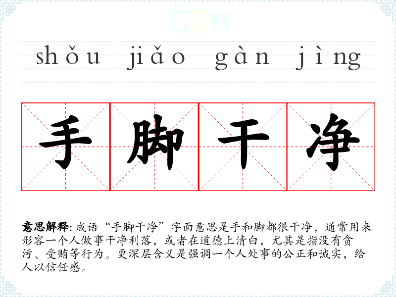 成语“手脚干净”字面意思是手和脚都很干净,通常用来形容一个人做事干净利落,或者在道德上清白,尤其是指没有贪污、受贿等行为。更深层含义是强调一个人处事的公正和诚实,给人以信任感。