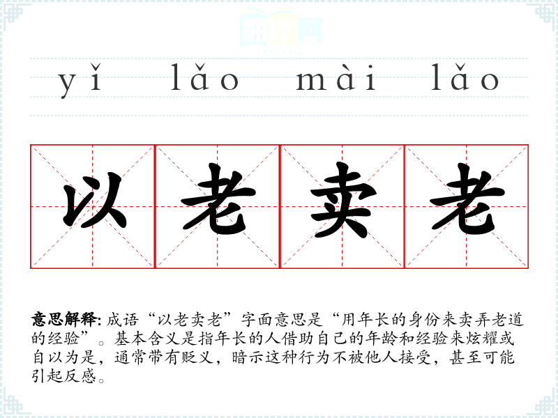 成语“以老卖老”字面意思是“用年长的身份来卖弄老道的经验”。基本含义是指年长的人借助自己的年龄和经验来炫耀或自以为是,通常带有贬义,暗示这种行为不被他人接受,甚至可能引起反感。